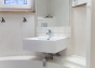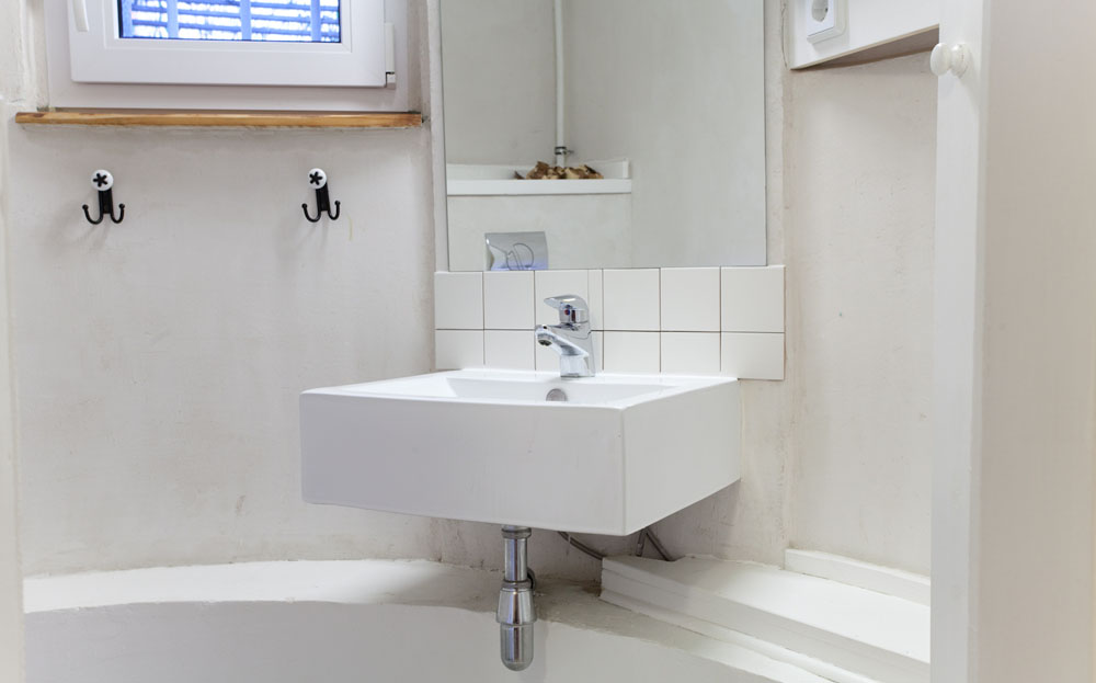 Das Badezimmer ist sehr funktionell es verfügt es über ein Waschbecken, eine Dusche, eine Heizung für Handtücher und einen Fön.